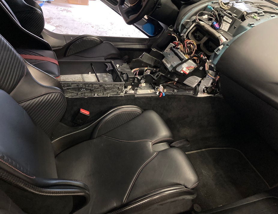 Intégration d'un ensemble complet (Ecran + Nav Surround / Center Ski Slope & Nav door + Interface de commande d'ouverture / fermeture d'écran + Apple Carplay & Android Auto + Caméra de recul + Caméra avant multi-angles + Nouveau cuvelage de cendrier + Ecran HD) sur une V8 Vantage livrée neuve sans GPS ni écran.