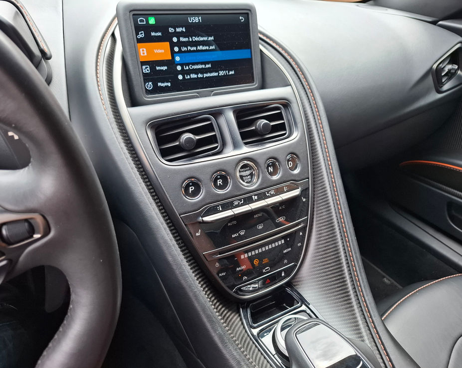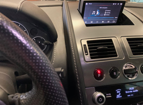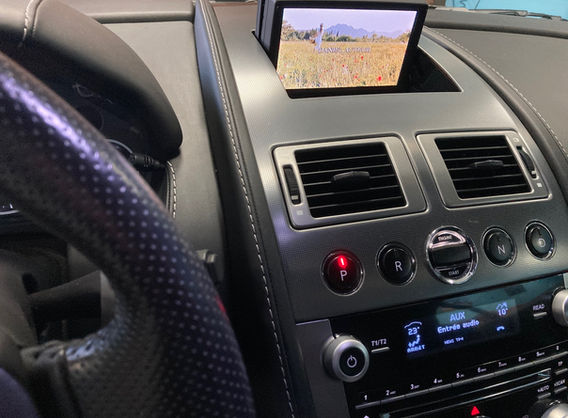 Exemple d'installation réalisée par GO FAST SARL sur Aston Martin DB9 Coupé 2013 (Apple Carplay + Android Auto + Caméra Avt avec reprise de l'Arr) et interfacée à 100% sur le système audio / GPS d'origine :