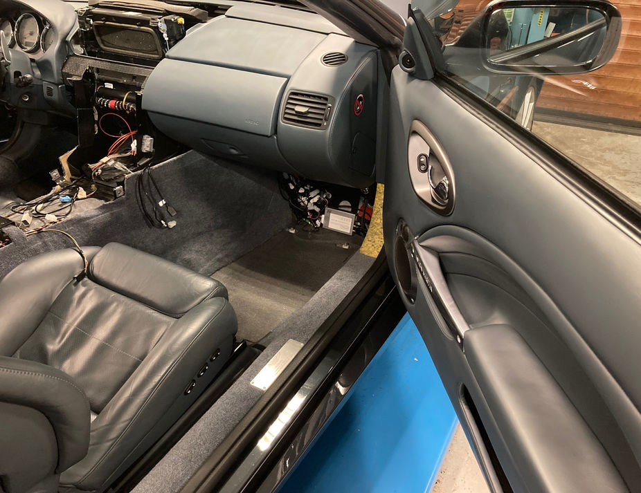 Intégration d'un ensemble Apple Carplay & Android Auto + Caméra Avant Multi-Angles + Caméra de recul + Ecran HD + Inteface Audio MOST (DENSION Update) + Cuvelage de cendrier sur mesures sur une Aston Martin V8 Vantage 4.3 de 2006 (AMI I Volvo Based) :
